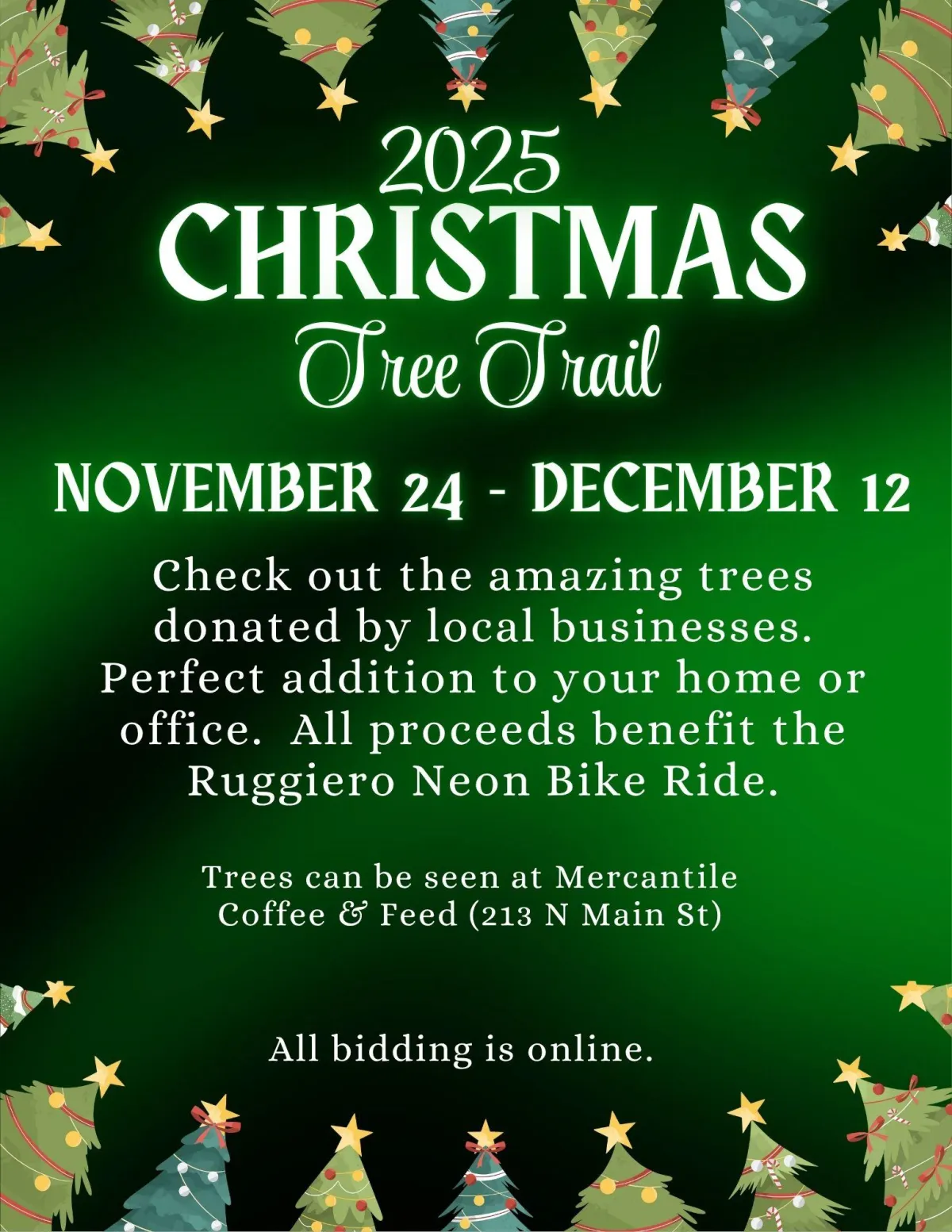 Please note: Trees/Wreath must be set up and ready at Mercantile Coffee & Feed by November 24th at Noon.